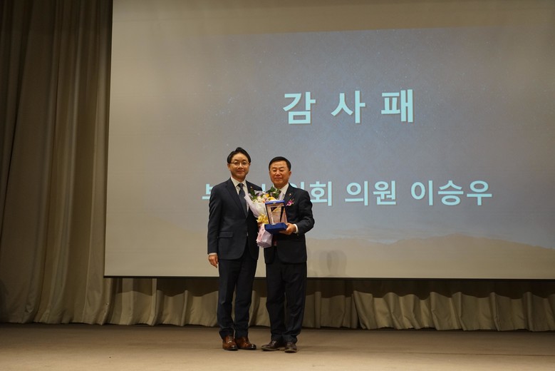 [부산 세계타임즈=이용우 기자] 부산광역시의회 기획재경위원회 이승우 의원(국민의힘, 기장군2)은 지난 22일, 롯데호텔에서 개최된 ‘2025 부산광역시 약사회 정기총회’에서 약사회로부터 감사패를 수상했다. 이번 감사패는 이승우 의원이 시민들의 의약품 접근성을 높이고, 약사의 역할을 강화하는 데 기여한 공로를 인정받은 것이다.