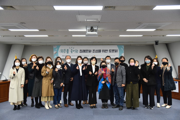 ‘1회용품 줄이는 장례문화 조성을 위한 정책토론회’가 15일 오후 2시 광주광역시의회 5층 예산결산특별위원회실에서 열렸다. 이날 토론회는 광주광역시의회 환경복지위원장 신수정 의원(더불어민주당.북구3)을 좌장으로 나해란 자원순환사회연대 연구원이 ‘장례식장 1회용 줄이기 정책 및 1회용품을 쓰지 않는 지역 사례’라는 주제로, 허승희 광주전남녹색소비자연대 사무처장이 ‘2020 광주 관내 장례식장 모니터링 및 시민인식조사 결과’로 발제를 맡았다. 토론자로는 구성룡 천지장례식장 전무, 백은정 광주광역시 자원순환과 정책팀장, 최낙선 광주자원순환협의체 위원장이 참여하였다.