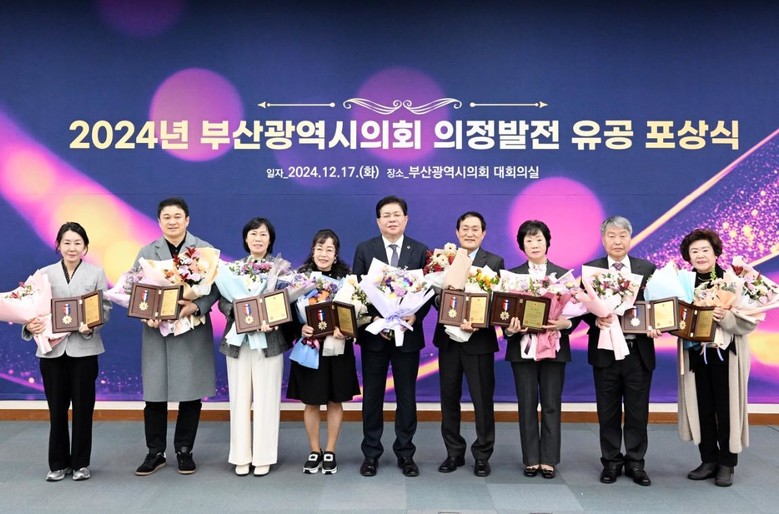 한편, 부산광역시의회(의장 안성민)는 12월 17일(화) 부산광역시의회 대회의실에서 2024년도 부산광역시의회 회기를 마무리하며, 지역사회와 의정 발전에 기여한 유공자의 공로를 인정하고 격려와 감사를 전하기 위한 「2024년도 부산광역시의회 의정발전 유공 포상식」을 개최하였다. 포상식에서는 대한민국시도의회의장협의회(회장 안성민) ‘우수의정대상’에 부산광역시의원 10명, 부산광역시의회 ‘의정발전 유공 포상’에 부산시민 10명이 수상하는 영광을 안았다.