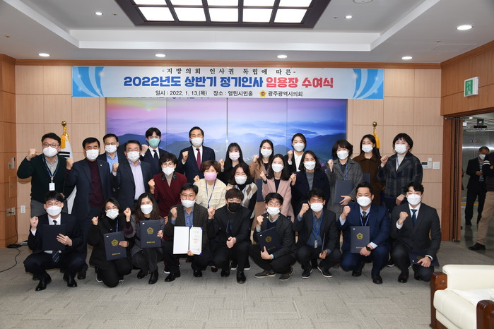 [광주=세계타임즈 손권일 기자] 광주광역시의회(의장 김용집)는 1월 13일 2022년도 상반기 정기인사에 따른 임용장 수여식을 가졌다.