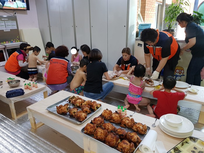 통닭 봉사 신상일 회장은 “물놀이 이후에 간식시간에 뜨끈뜨끈한 통닭을 맛있게 먹는 아이들의 모습에서 행복과 보람을 느낀다.“고 말했다.