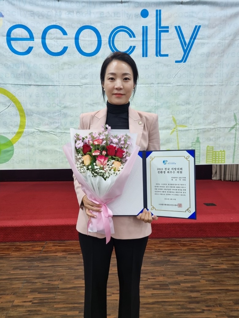 [남동구 세계타임즈=심하린 기자] 남동구의회 육은아 의원(국민의힘/논현1‧2동,논현고잔동)은 19일 지속가능한 지역사회 발전을 주도하며 친환경 정책개발을 위해 노력한 의원에게 수상하는 2023년 전국지방의회 친환경 최우수 의원상을 수상했다.
