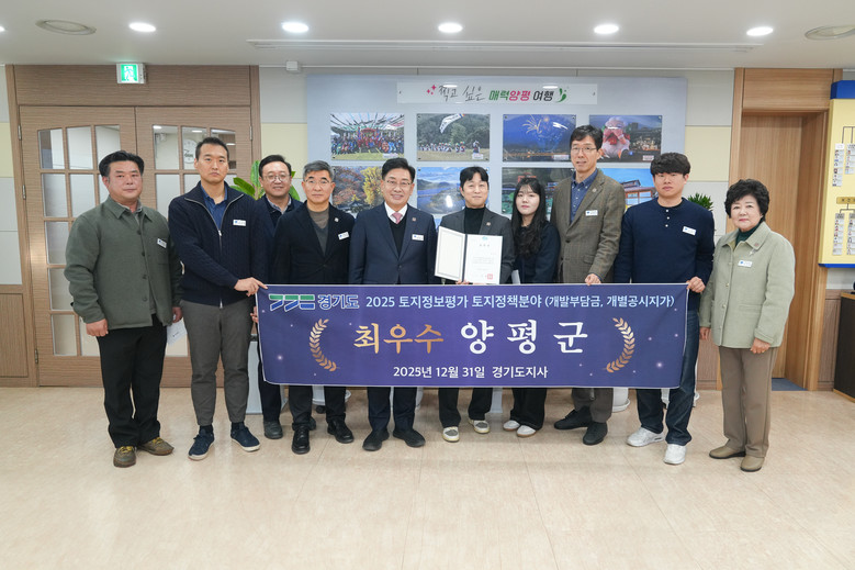 [양평군 세계타임즈=송민수 기자] 양평군(군수 전진선)은 경기도가 주관한 ‘2025년 토지정보 종합평가’에서 토지정책 분야(개발부담금 및 개별공시지가) 최우수 기관으로 선정됐다고 밝혔다.
