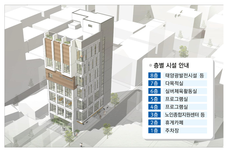 1층에는 주차장, 2층에는 지역 주민 누구나 이용할 수 있는 휴게 카페, 3층에는 노인종합상담, 노인 일자리 사업, 경로당 활성화 사업 등을 담당할 노인종합지원센터와 (사)대한노인회 서구지회 사무실이 들어선다. 4∼5층에는 각종 프로그램실이 마련되는데 복지기관 및 단체들과 연계해 디지털 에이징, 교육, 문화, 창의 활동 프로그램 운영과 세대 통합형 커뮤니티 공간 등으로 활용된다. 6층은 실버체육활동실(헬스케어, 건강관리), 7층은 다목적실, 8층에는 태양광발전 시설 등이 조성된다.