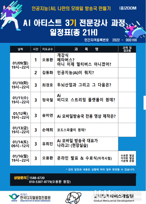 이러한 시점에서 글로벌메타버스개발원에서는 시대가 요구하는 인재를 양성하고 일자리를 창출하기 위해 ’AI아티스트 3기 전문가 과정‘을 개설해 운영한다.
