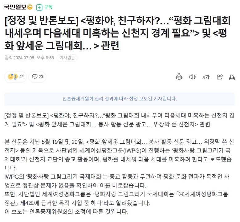 ㈔세계여성평화그룹(IWPG)이 언론중재위원회 조정을 통해 <국민일보>를 상대로 ‘정정 및 반론 보도’를 이끌어냈다.