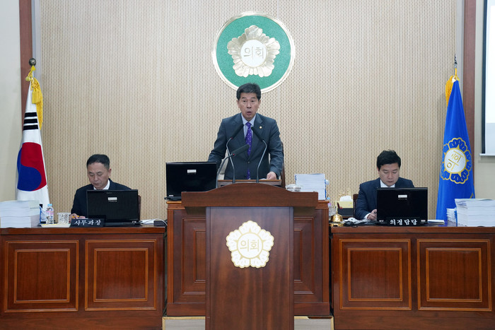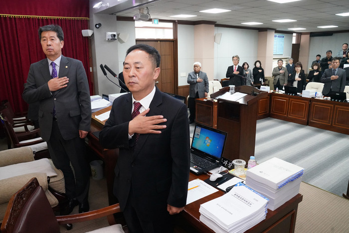 [양구군=세계타임즈 김민석 기자] 양구군의회 제255회 제2차 정례회 개회식이 25일 의회 본회의장에서 조인묵군수, 이상건의장, 박귀남부의장, 의원, 실과소장들이 참석한 가운데 열렸다.