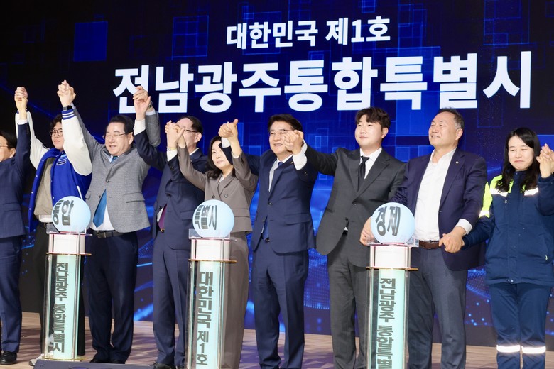 이날 행사에는 전남도의장, 전남도지사, 광주시장, 국회의원, 광주시 부의장 등 주요 인사와 시도민 500여 명이 참석해 전남·광주 행정통합의 역사적 의미를 함께 나눴다.