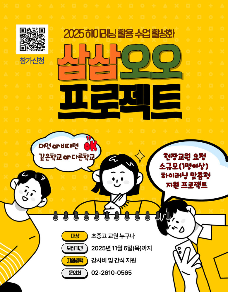 ‘삼삼오오 프로젝트’는 교원이 원하는 대상·일시·장소·내용·방법에 맞추어 운영되는 소규모 현장 맞춤형 프로그램으로, 현장의 요청을 즉시 반영해 제공하는 촘촘한 하이러닝 지원이 특징이다. 신청 인원이 1명이어도 운영 가능하며, 하이러닝 멘토링·모니터링·실습 연수·운영 사례 나눔 등 대면·비대면 방식 중 교사가 원하는 형태로 제공됐다. 특히 교원이 요청한 시간에 최소 1시간부터 자유롭게 운영되어 연수 참여 편의성을 크게 높였다.