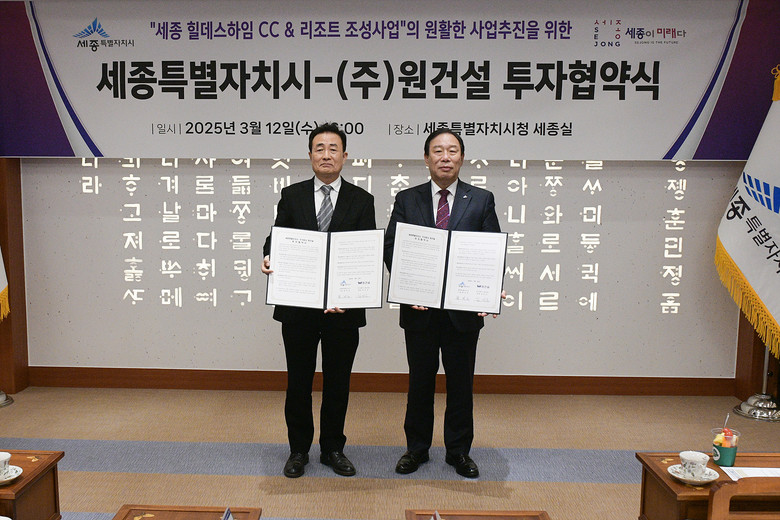 [세종 세계타임즈=이채봉 기자] 세종특별자치시(시장 최민호)가 12일 시청 세종실에서 주식회사 원건설(회장 김민호)과 ‘세종 힐데스하임CC & 리조트 조성’을 위한 양해각서를 체결했다.