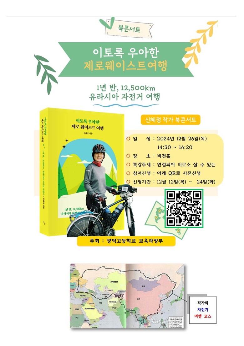광덕고등학교 임도윤(1학년) 학생은 “평소 환경보호는 어렵다고 생각했는데, 제로 플라스틱 운동을 실천하면서 자전거로 유라시아 대륙을 횡단한 여행이 궁금해 강연에 참여할 생각이다”고 말했다.