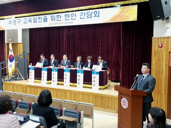 [대구=세계타임즈 한성국 기자] 대구광역시의회 교육위원회는 11월 22일 오후 3시 대구수성초등학교 시청각실에서 수성구 지역 26개교 학교장, 학교 운영위원 및 학부모 등을 초청해 현장의 목소리를 청취하고 교육현안 문제 해결 및 의정활동 반영을 위한 간담회를 개최하였다.