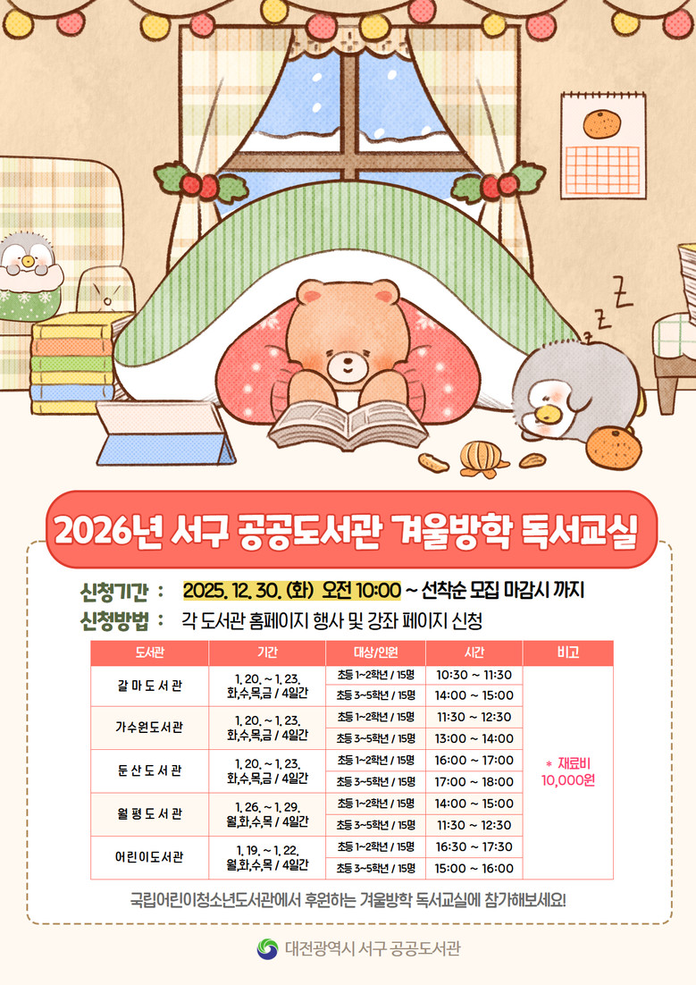 프로그램은 내년 1월 19일부터 29일까지 도서관별로 4일간, 총 4차시로 진행된다. 갈마·가수원·둔산·월평·어린이도서관에서 운영되며, 연령과 독서 수준을 고려해 1~2학년과 3~5학년으로 나눠 반별 15명씩 모집한다.