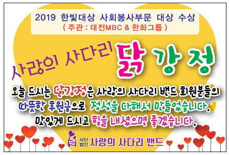 현재 9,200명으로 구성된 사랑의 사다리 밴드는 지방자치단체의 보조금 지원없이 회원들의 후원금으로 매주 2회 대전시 5개 구 소외계층을 위해서 닭강정 봉사로 우리 사회의 따뜻한 사랑 나눔을 꾸준히 펼치고 있다.