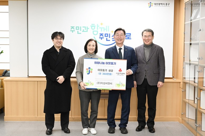 [중구 세계타임즈=이채봉 기자] 대전 중구(구청장 김제선)는 지난 6일 ㈜미성씨앤씨(대표 김명희)로부터 매월 30만원씩(1년간 총 360만원) 희망! 2040 이웃돕기 성금을 정기 기탁받았다고 밝혔다.