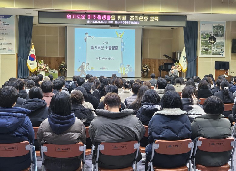[미추홀구 세계타임즈=심하린 기자] 인천 미추홀구(구청장 이영훈)는 28일 구청 대회의실에서 소속 직원 200여 명을 대상으로 조직 내 소통과 공감 능력을 향상하고 배려가 넘치는 선진적인 근무 환경을 구축하기 위한 ‘혁신적인 조직문화 조성’ 특별교육을 실시했다.