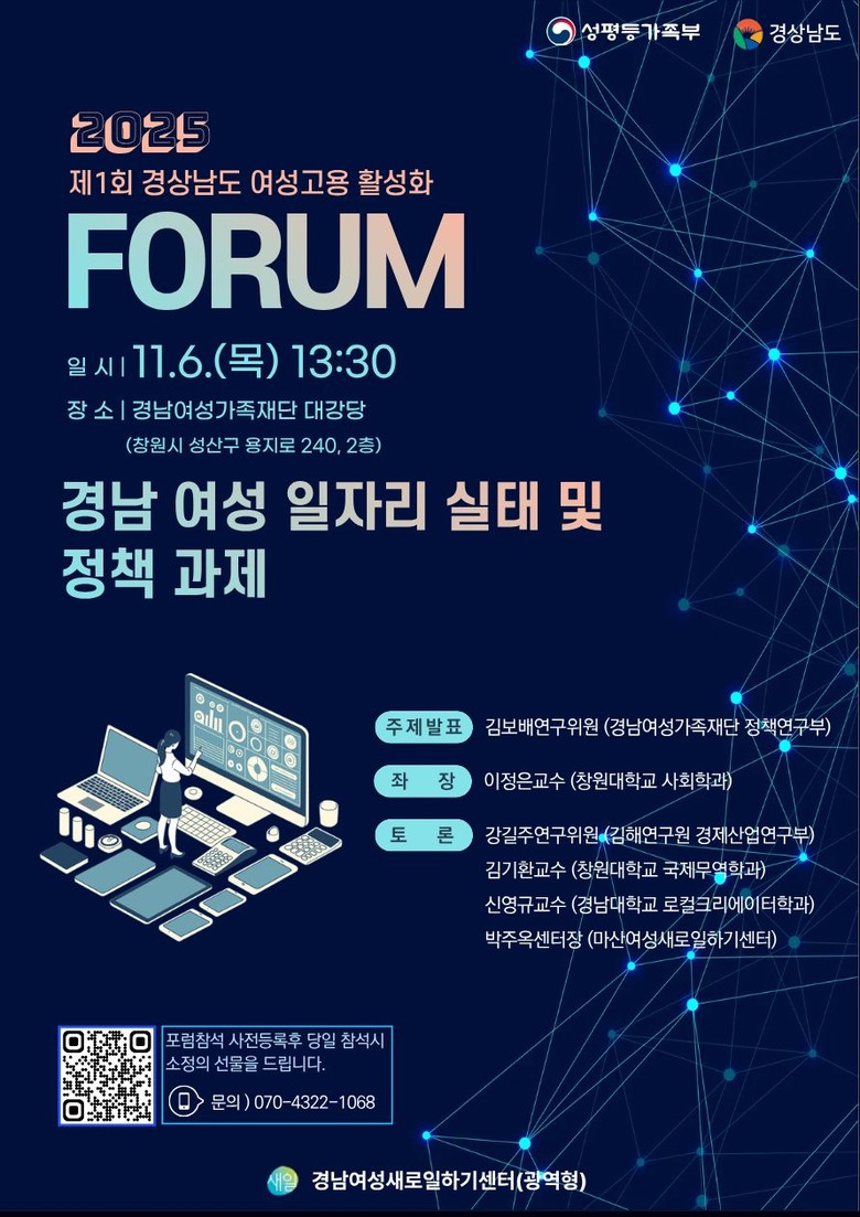 경상남도가 주최하고 경남여성새로일하기센터(이하 경남새일센터)가 주관하는 이번 포럼은 여성의 경제활동 참여 확대와 여성친화적 노동환경 조성을 위한 정책 방향을 논의하기 위해 마련됐다.