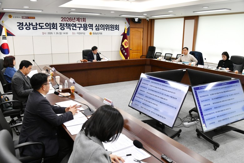 [경남 세계타임즈=최성룡 기자] 경상남도의회는 1월 26일(월), 의정회의실에서 ‘2026년 제1회 정책연구용역 심의위원회(위원장 서민호)’를 개최하고, 올해 상반기 추진될 8개 과제를 최종적으로 확정하며 민생 중심의 정책연구 활동에 본격적으로 나섰다.