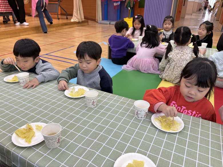 유아들은 지난 가을 텃밭에서 배추 모종을 심고, 물을 주며 배추가 자라는 모습을 지켜보았다. 꾸준히 관심을 기울이며 돌봐 온 배추가 무럭무럭 자라자 교직원들은 이를 활용해 ‘배추전’을 만들어 아이들이 함께 경험할 수 있는 시간을 준비하였다. 아이들은 자신들이 키운 배추가 실제 음식으로 만들어진 모습을 보며 큰 흥미와 호기심을 보였으며, “내가 키운 배추가 이렇게 전이 되었어요!”라고 이야기하는 등 생명과 먹거리가 이어지는 과정에 자연스럽게 몰입하는 모습을 보였다.