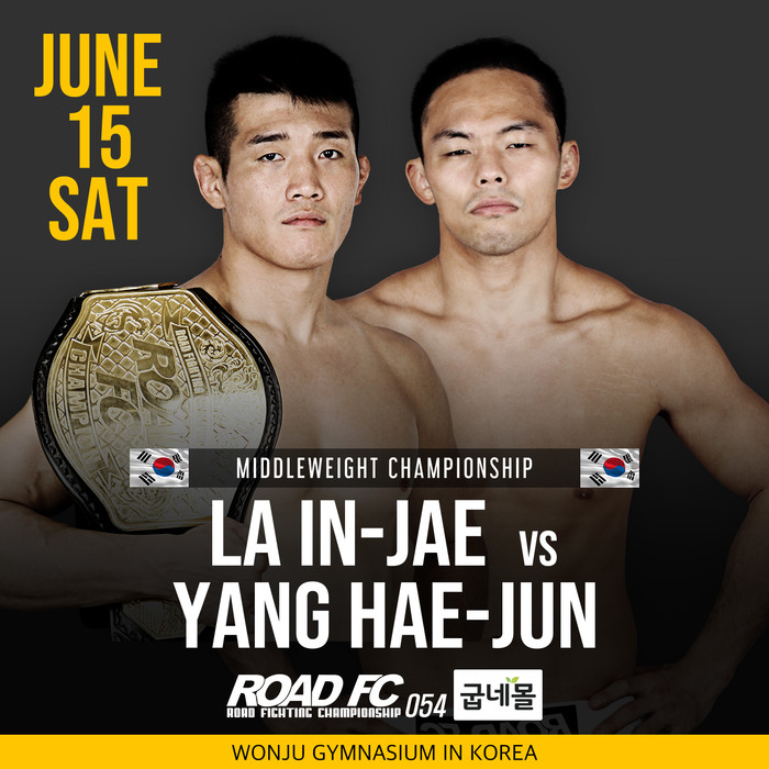 굽네몰 ROAD FC 054의 메인 이벤트는 ‘미들급 챔피언’ 라인재와 ‘리치’ 양해준의 미들급 타이틀전이다. 라인재는 지난해 원주 종합체육관에서 챔피언이 된 뒤 1차 방어전을 같은 장소에서 치르게 됐다.