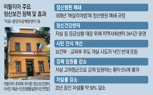 이탈리아의 경우, 40년 전부터 정신병원을 없애고 지역 사회 내에서 지역사회에서 치료와 재활을 받도록 하고 있다. 문화 활동과 일자리를 연계해 사회적 교류와 자립 또한 돕는다. 그 결과, 실제 환자들이 호전돼 자립하면서 자살을 포함한 정신질환 관련 사건‧사고가 크게 줄었다고 한다. 이에 대해 이탈리아 보건당국은 “사회적 낙인을 없애고 조현병 환자 또한 같은 사회 구성원임을 강조하기 위함”이라고 설명했다.