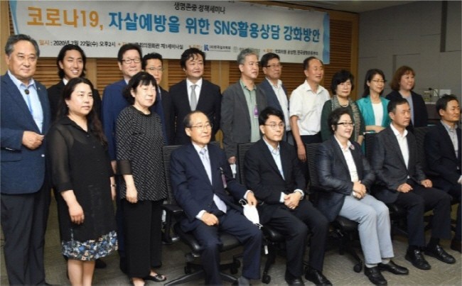 (사진=22일 국회의원회관에서 열린 '코로나19, 자살예방을 위한 SNS 활용 상담 강화방안' 정책 세미나에서 참석자들이 사진을 찍고 있다)
