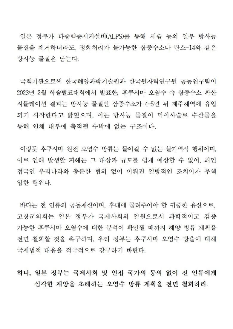 고창군의회는 이번 성명서를 통해서 △일본 정부는 국제사회 및 인접 국가의 동의 없는 오염수 방류 계획 전면 철회할 것, △일본 정부는 국제사회의 일원으로서 후쿠시마 원전 오염수 처리에 대한 모든 정보를 대한민국 정부와 국제사회에 투명하게 공개할 것, △대한민국 정부는 국제사회와 공조를 강화하여 일본 정부의 후쿠시마 원전 오염수 해양 방류 저지를 위해 국제법적 대응에 나설 것 등을 촉구했다.
