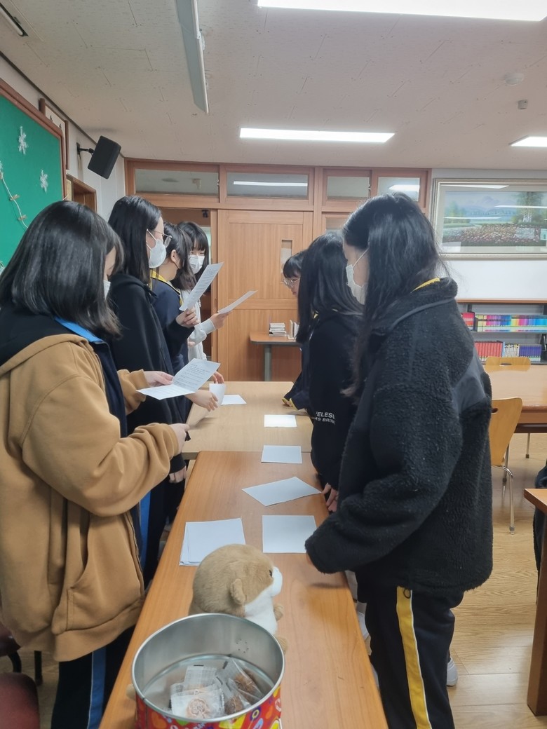 특히 10월 26일(목) 점심시간을 활용해 도서관에서 진행된 ‘독서 퀴즈 풀기 행사’에서는 모둠별 독도 관련 퀴즈를 풀고, 모듬원 전체가 퀴즈를 모두 푼 학생들에게 소정의 간식을 제공하는 등 독도사랑주간 행사 중 금릉중 학생들의 가장 큰 호응을 얻었다.
