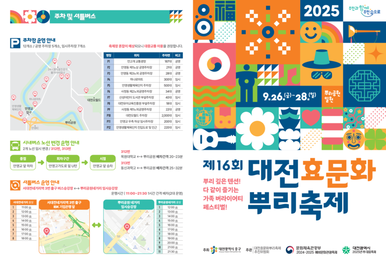 한편, 중구는 ‘제16회 대전효문화뿌리축제’를 찾는 시민들을 위해 뿌리공원 인근 언고개 교통광장 및 안영동 공영주차장, 하나로마트 주차장 등 총 12개소의 주차장을 마련했다. 축제 기간 312번, 313번 시내버스 노선 임시변경을 통해 뿌리공원 접근성을 높이고, 서대전네거리역 3번출구 버스승강장에서 뿌리공원네거리 임시승강장까지 1시간 간격으로 셔틀버스도 운행한다.