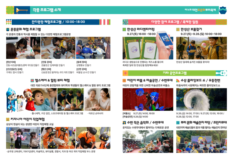 대전효문화뿌리축제의 무대가 되는 뿌리공원을 제대로 즐기는 방법. 축제 기간 ‘만성산에 숨겨진 보물찾기’와 ‘라디엔티어링 체험’을 통해 뿌리공원의 숨은 멋을 느끼고 다양한 경품도 받을 수 있다. 축제의 기억을 사진으로 남길 수 있는 ‘포토존’도 운영된다.