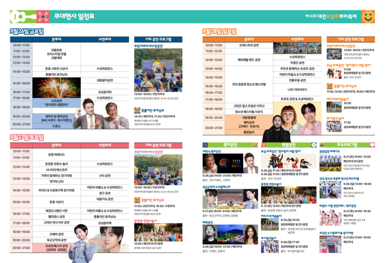 매년 꿈과 끼를 통해 대전효문화뿌리축제를 빛낸 주인공들도 방문객을 만난다. 28일 메인무대에서 펼쳐진 ‘전국 효문화 청소년 페스티벌’과 27일 ‘가족이 함께하는 장기자랑’, 26일 ‘외국인 장기자랑’은 특별한 감동을 선사한다.