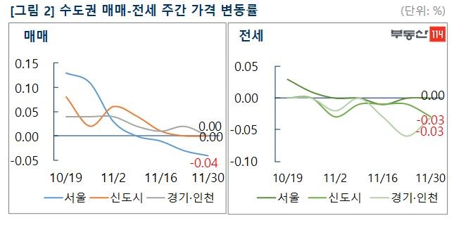 부동산114(www.r114.com)에 따르면 11월 마지막 주 서울 아파트 매매가격은 0.04%(재건축 -0.08%, 일반 -0.03%) 떨어지며 지난주의 -0.03% 대비 하락폭이 커졌다. 송파구와 강동구 일대에 위치한 재건축아파트 중심으로 수요가 위축되고 거래가 끊기면서 하락폭이 확대되는 양상이다. 다만 신도시(0.00%)와 경기·인천(0.00%) 지역은 전주와 마찬가지로 보합 수준에서 움직임은 크지 않았다.