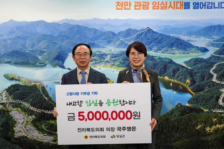 국주 의장은 이날 임실군청을 찾아 심민 군수에게 고향사랑기부금 최고액인 500만원을 기탁했다. 답례품은 신청하지 않았다.