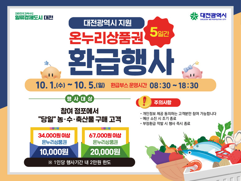 이번 행사는 농림축산식품부·해양수산부가 주관하는 전국 환급행사와 연계해 추진되며, 대전시민이 더 많은 혜택을 체감할 수 있도록 지역 전통시장에서 별도 운영된다.