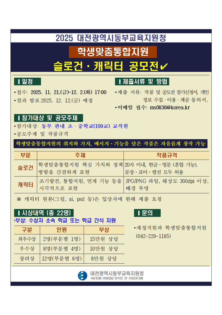 공모전은 학생맞춤통합지원의 핵심가치가 학교 현장의 시각과 경험을 통해 정책 표현에 자연스럽게 담길 수 있도록 마련되었으며, 동시에 대전동부교육지원청 Care-Full 학생맞춤통합지원 운영브랜드의 시각적·언어적 표현을 강화하는 홍보 도구 개발을 목표로 한다. 작품 접수 기간은 2025. 11. 21.(금) ~ 12. 2.(화)이며, 참여 대상은 동부 관내 초·중학교 교직원이다.