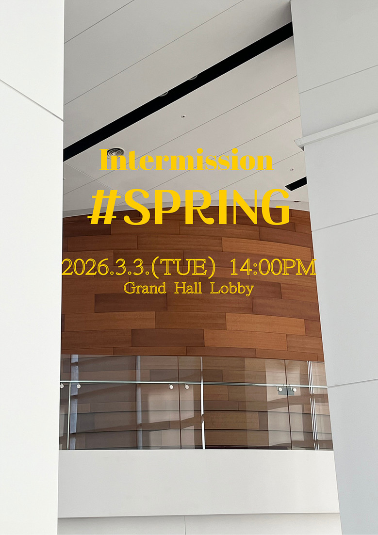 ‘인터미션’은 시민들에게 일상 속 클래식 음악 감상의 기회를 제공하는 공연이다. 이번 무대는 ‘봄’을 주제로 하여, 한국 가곡과 오페라 아리아 등 성악 작품을 중심으로 준비하였다. 소프라노 곽보라와 김효진, 피아니스트 박선민과 함께 봄의 정취를 가까이에서 만나볼 수 있다.