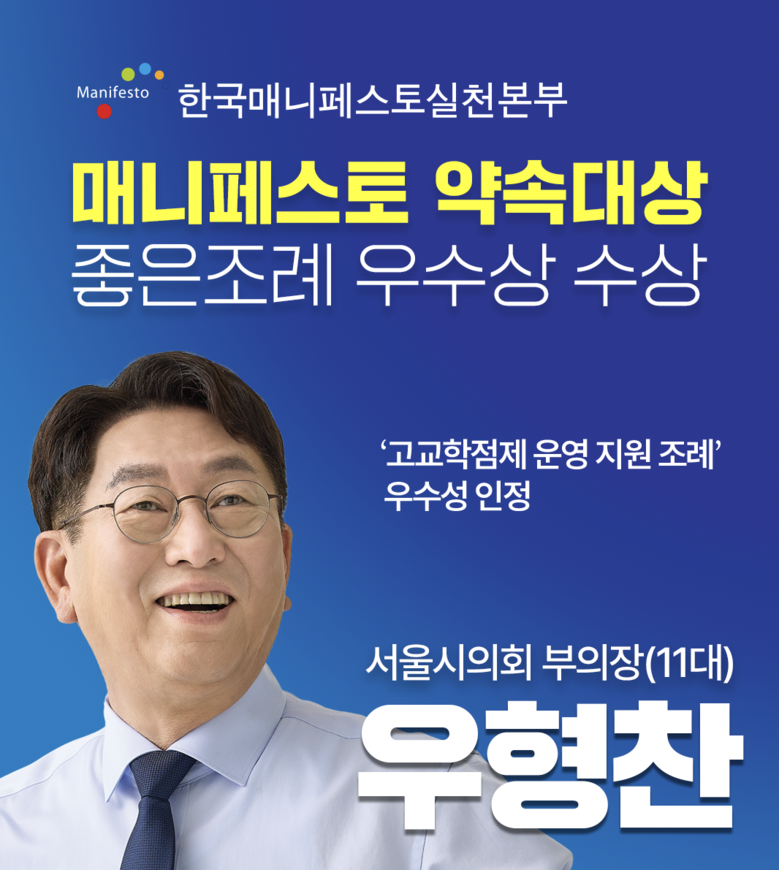 - 학생·보호자 설명회 연 1회 이상 규정…정보격차로 인한 사교육 쏠림 차단 효과 기대 [서울 세계타임즈=이장성 기자] 서울시의회 우형찬 의원(더불어민주당, 양천3)이 한국매니페스토실천본부가 주관한 ‘제17회 2025 지방의원 매니페스토 약속대상’에서 ‘좋은조례’ 분야 우수상을 받았다. 한국매니페스토실천본부는 지방의회 역량 강화와 주민 신뢰기반 구축을 목적으로 약속대상을 운영하고 있다.