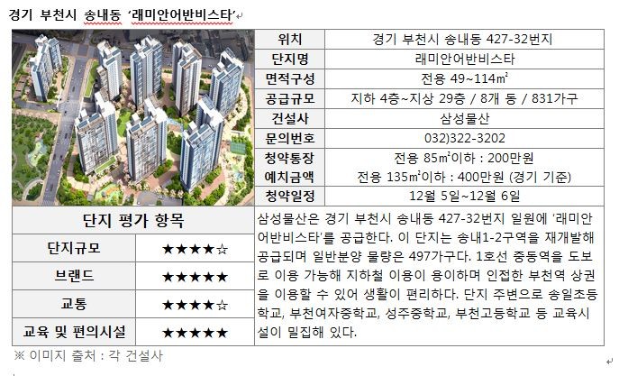 ‘삼호가든맨션3차’를 재건축하는 단지로 3.3㎡당 4,687만원의 평균 분양가로 공급된다. 11월 분양한 서초동 ‘래미안리더스원’ 평균 분양가 4,489만원보다 약 4% 오른 가격이지만 주변 시세보다 저렴하다는 평을 받고 있다. 그 외 서울 은평구 응암동 ‘힐스테이트녹번역’, 경기 부천시 송내동 ‘래미안어반비스타’가 수도권 역세권 입지를 갖춰 눈길을 끌 전망이다.