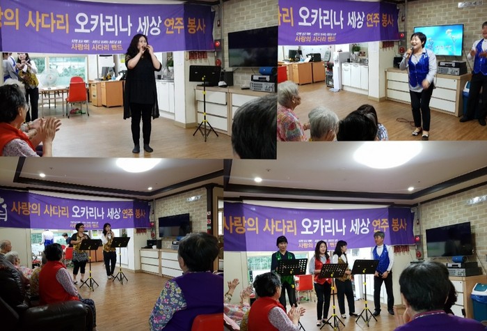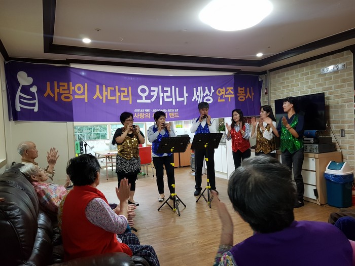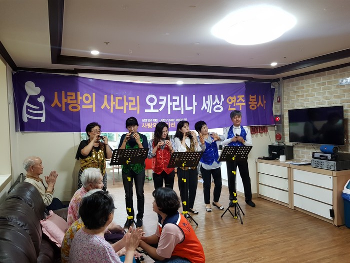 사단법인 사랑의 사다리 밴드의 오카리나 세상 연주봉사는 매월 셋째 주 토요일에 요양원, 보육원 등에서 꾸준한 이웃 사랑을 실천하고 있다.