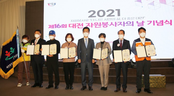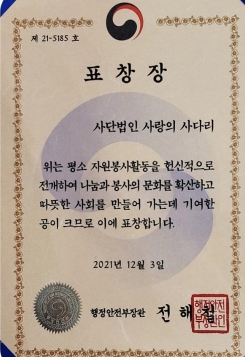 [대전=세계타임즈 이채봉 기자] 코로나19로 힘든상황에서도 비대면 봉사로 다양한 봉사를 펼치고 있는 사단법인 사랑의 사다리 밴드(리더 이정제)는 7일 오후2시, 오페라 웨딩홀 4층에서 열린 제16회 대전자원봉사자의날 기념식에서 2021 대한민국 자원봉사 대상으로 행정안전부 장관상을 수상하였다.