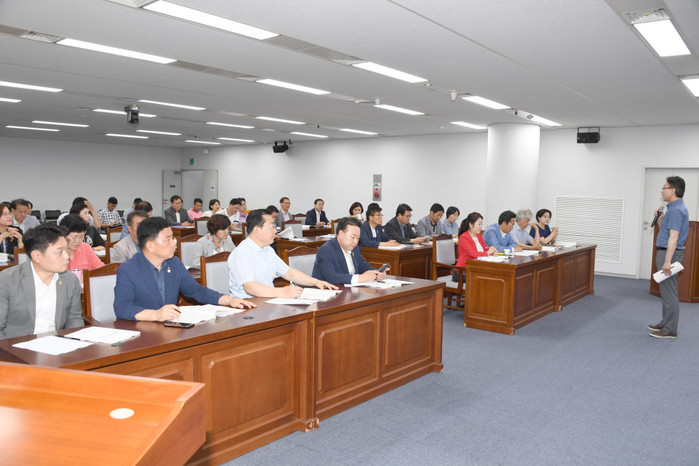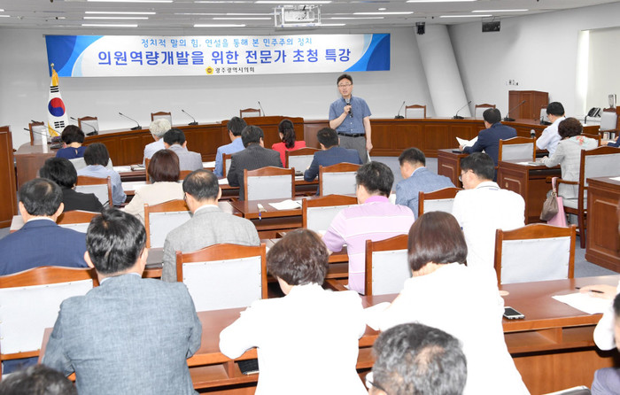[광주=세계타임즈 손권일 기자] 광주광역시의회(의장 김동찬)는 7월8일 오전9시30분 시의회 5층 예산결산특별위원회의실에서 광주시의원과 각 구 의원들이 참석한 가운데 박상원 국회미래연구원을 초청해 특강을 진행했다