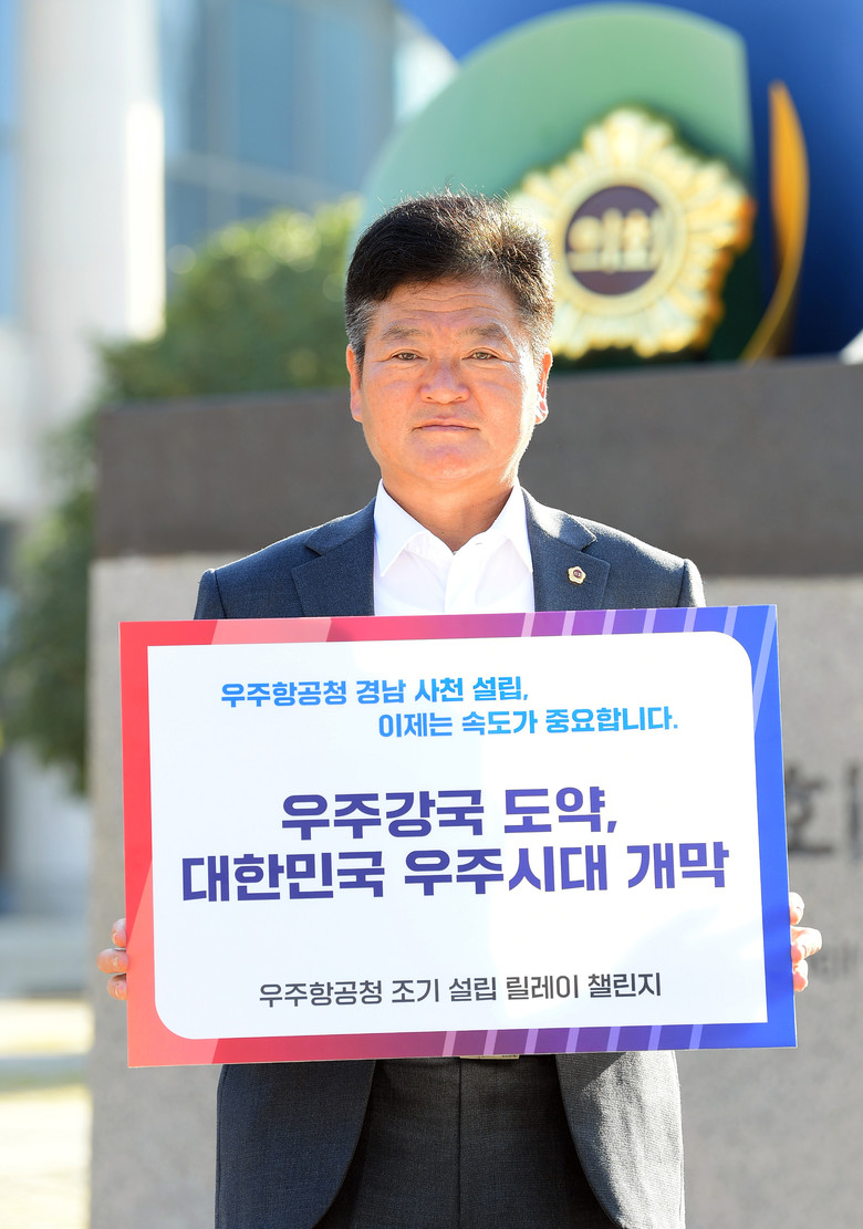 [경남 세계타임즈=최성룡 기자] 경남도의회 경제환경위원회 김일수 위원장이 ‘우주항공청 조기 설립’을 위한 챌린지에 11월 1일 동참했다.