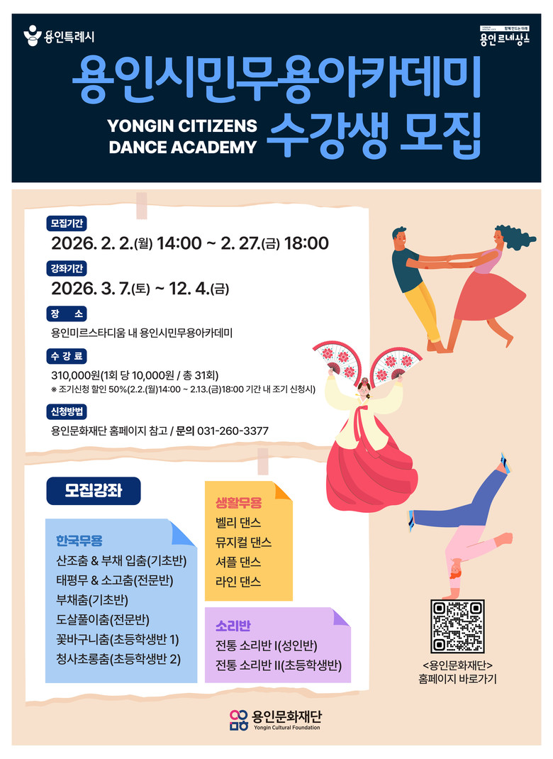 2026 용인시민무용아카데미 정규 강좌는 오는 3월 7일(토)부터 운영될 예정이며, 수강생 모집은 2월 2일(월)부터 27일(금)까지 진행한다. 2월 2일(월)부터 13일(금)까지 조기 신청자에게는 특별 할인 혜택이 제공된다. 자세한 내용은 용인문화재단 홈페이지에서 확인할 수 있으며, 문의는 예술단운영팀으로 하면 된다.