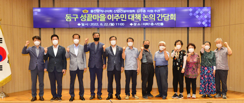 [울산 세계타임즈=이호근 기자] 울산광역시의회 김수종 의원(산업건설위원회)은 22일 오전 11시 시의회 1층 시민홀에서 ‘동구 성끝마을 이주민 대책 논의 간담회’를 개최했다.