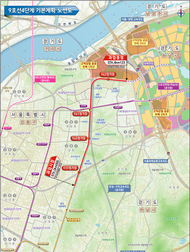 도시철도 9호선 4단계 연장사업은 강동구 중앙보훈병원역을 시작으로 길동생태공원, 한영고, 5호선 고덕역을 경유해 고덕강일1지구까지 4.12㎞ 구간에 4개 역을 신설하는 사업으로 3개 공사구역(이하 공구)으로 나누어 진행되고 있다.