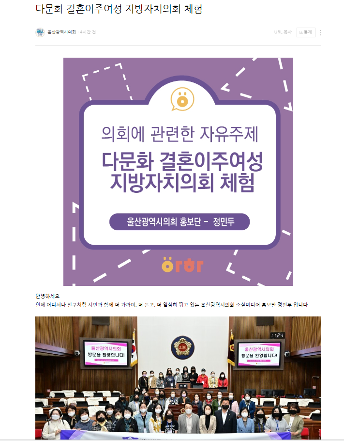 페이스북·인스타그램·카카오채널에는 5분자유발언, 임시회·정례회 의사보고, 상임위원회 현장활동 등 의정활동 소식뿐 아니라 시민들 생활에 도움이 되는 정책소식, 울산 축제 등을 소개하고 있다.