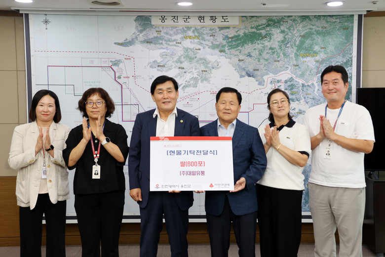 [옹진군 세계타임즈=심하린 기자] 옹진군(군수 문경복)은 지난 25일, ㈜대일유통(대표 박경서)으로부터 지역사회를 위한 나눔활동의 일환으로 쌀 600포(10kg 기준)를 기탁받아 이웃돕기 성품 기탁식을 진행했다고 밝혔다.