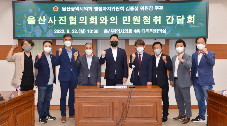 [울산 세계타임즈=이호근 기자] 울산광역시의회 김종섭 행정자치위원장은 22일 오전 10시 30분 시의회 5층 행정자치위원장실에서 한국프로사진협회 울산광역시 김하영 지회장 등 협회원 8명과 ‘울산지역 사진 산업 활성화에 관한 간담회’를 가졌다.