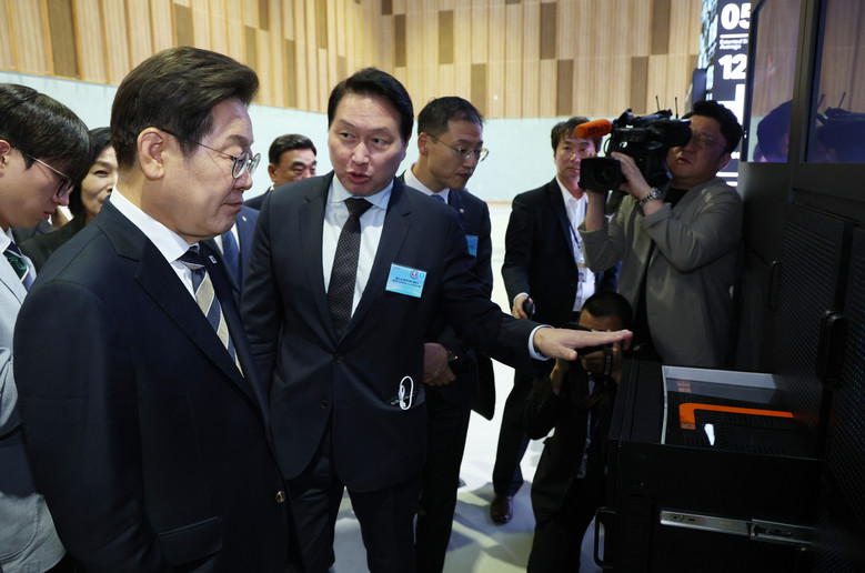 이재명 대통령이 20일 울산전시컨벤션센터에서 열린 인공지능(AI) 글로벌 협력 기업 간담회 뒤 AI 제품·서비스 시연을 참관하며 최태원 SK그룹 회장의 설명을 듣고 있다. 2025.6.20 [대통령실통신사진기자단]
