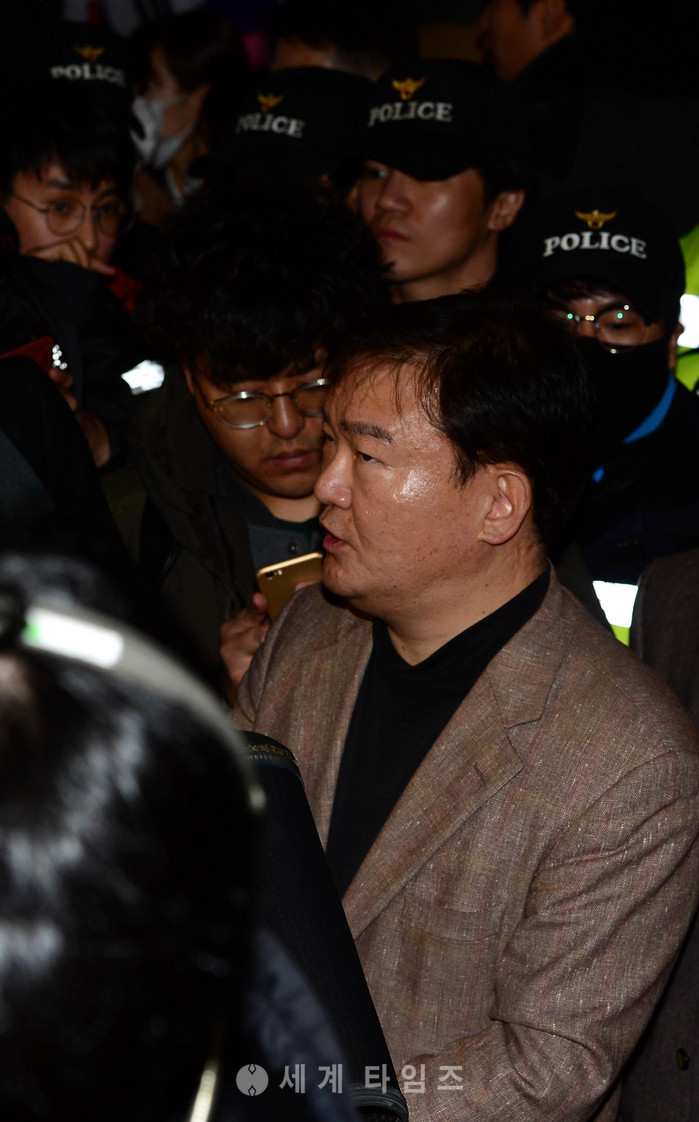 박근혜 전 대통령이 서울 삼성동 사저에 도착한 가운데 12일 오후 서울 삼성동 박 전 대통령 사저 앞에서 자유한국당 민경욱 의원이 박 전 대통령의 탄핵 관련 입장을 전하고 있다. 2017.03.12.